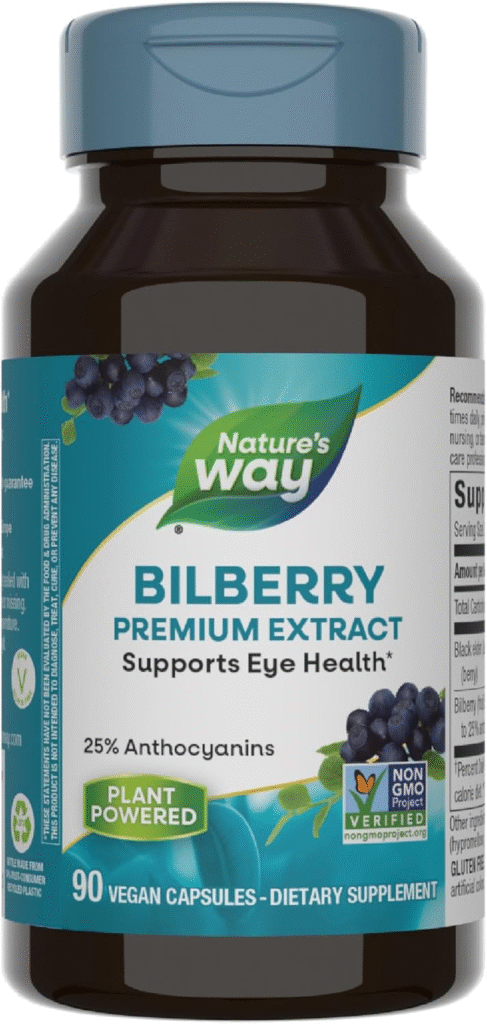 Nature’s Way offers a straightforward bilberry supplement with 80 mg of extract per capsule, standardized to 25% anthocyanins. This product is certified gluten-free and contains no artificial additives.