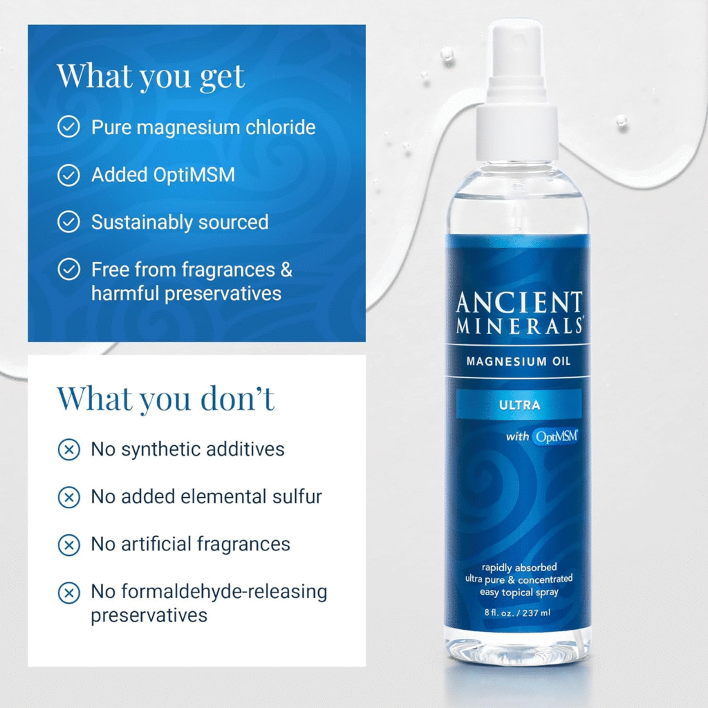 The Ancient Minerals Magnesium Oil Spray is a high-quality, pure magnesium chloride spray that’s perfect for this purpose. It’s sourced from the ancient Zechstein seabed and contains no added ingredients.