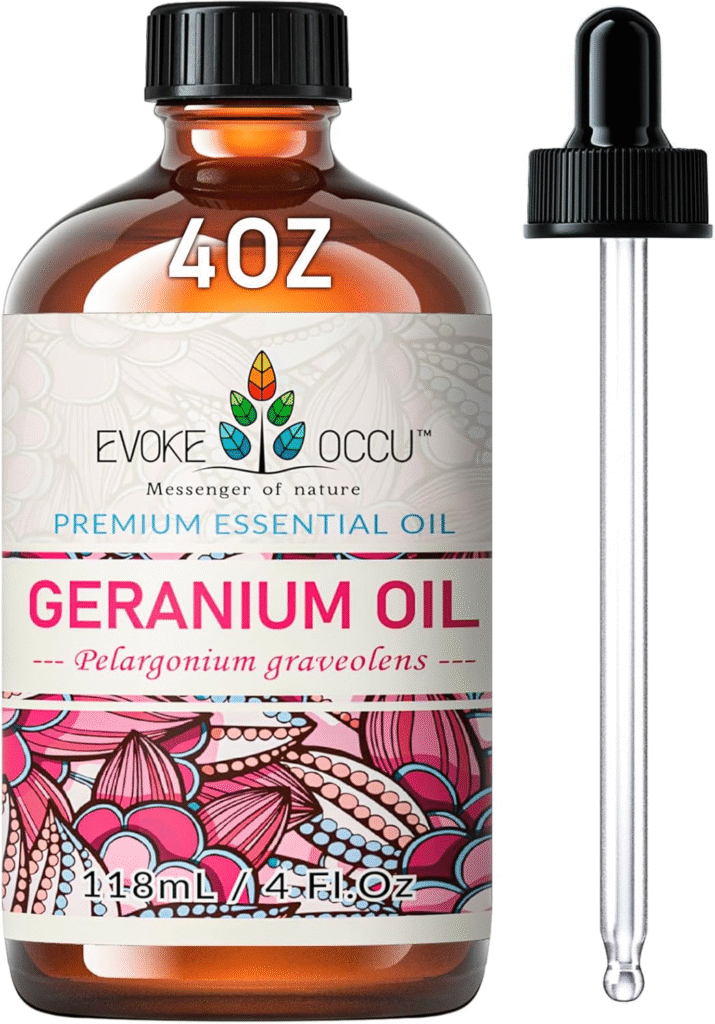 Try this product from Amazon: EVOKE OCCU Pure & Natural Geranium Essential Oil
